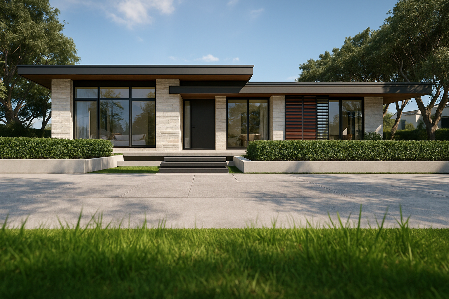 With its bold, twin-peak façade, this home immediately announces its originality. Timber cladding and expansive windows create a balance between architectural presence and natural warmth, allowing light to flood the interiors while maintaining a connection to the surrounding landscape.