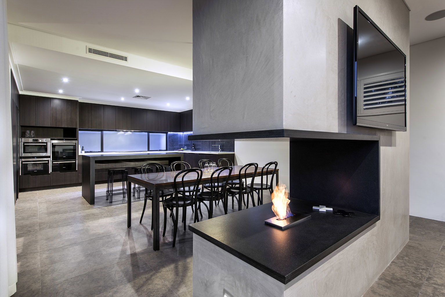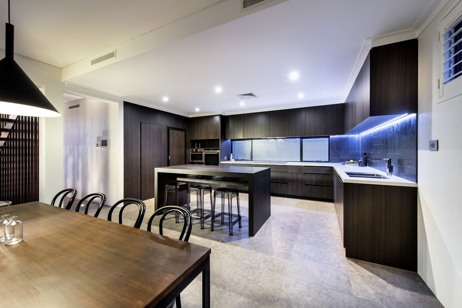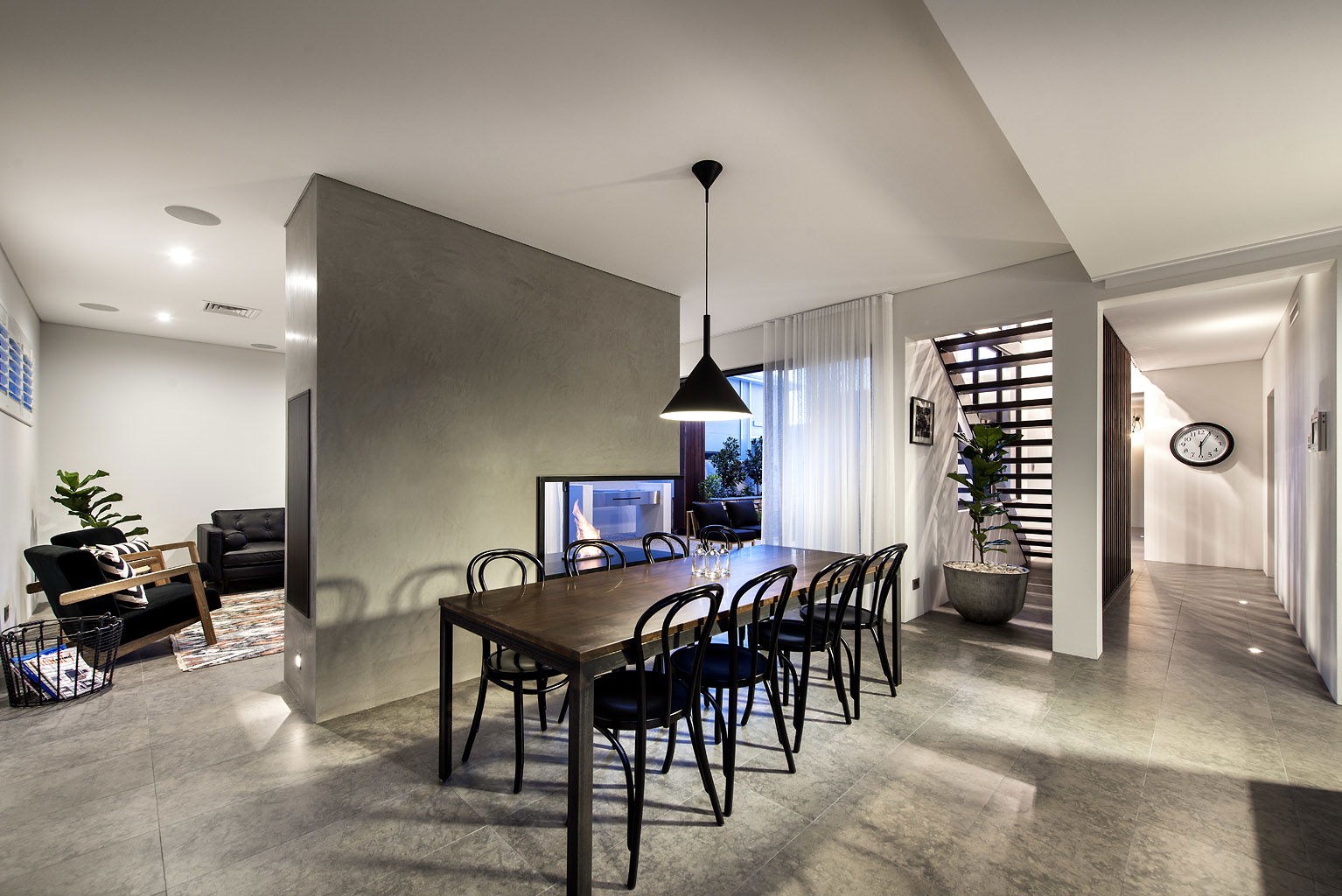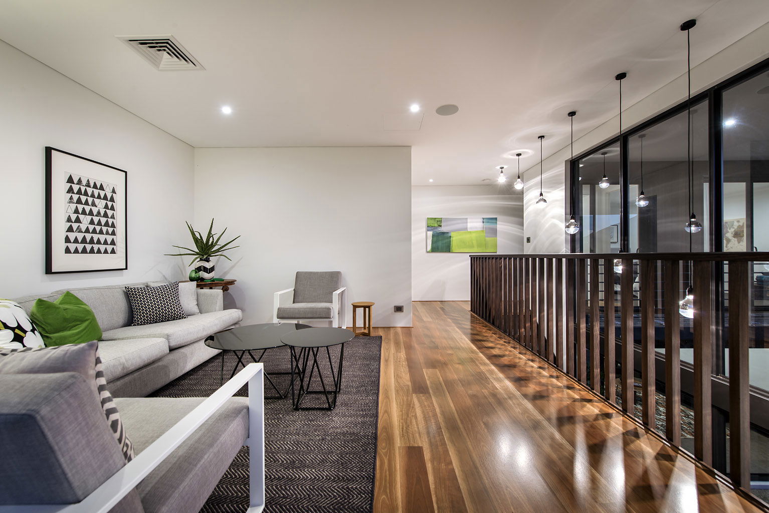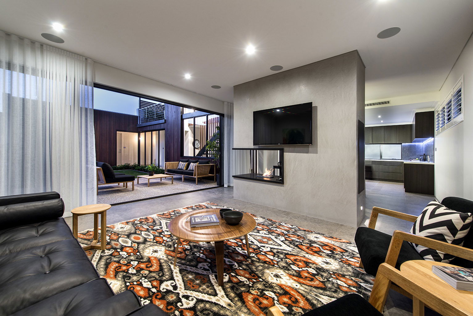 The breezy, open-plan ground floor features a home office, open-plan living and meals, and a kitchen with a cool room, all wrapping around the central courtyard.