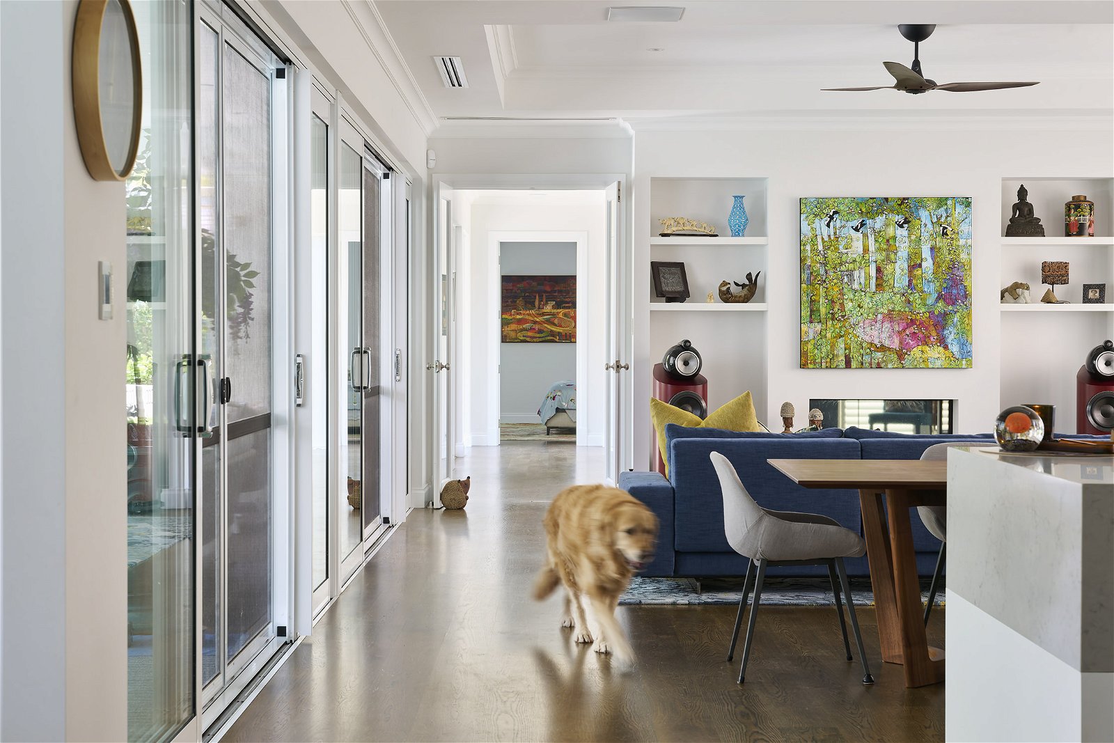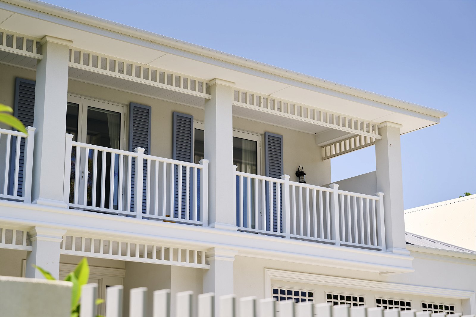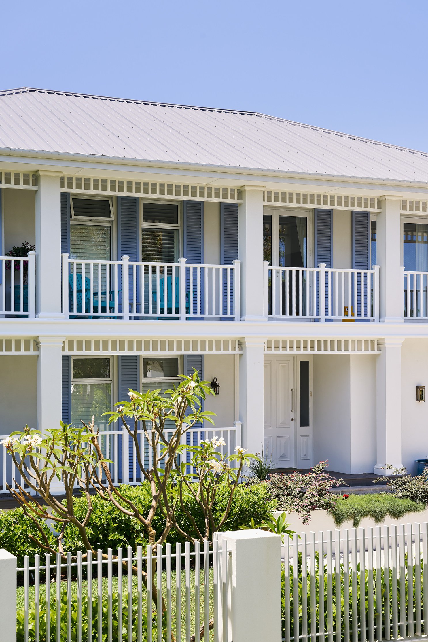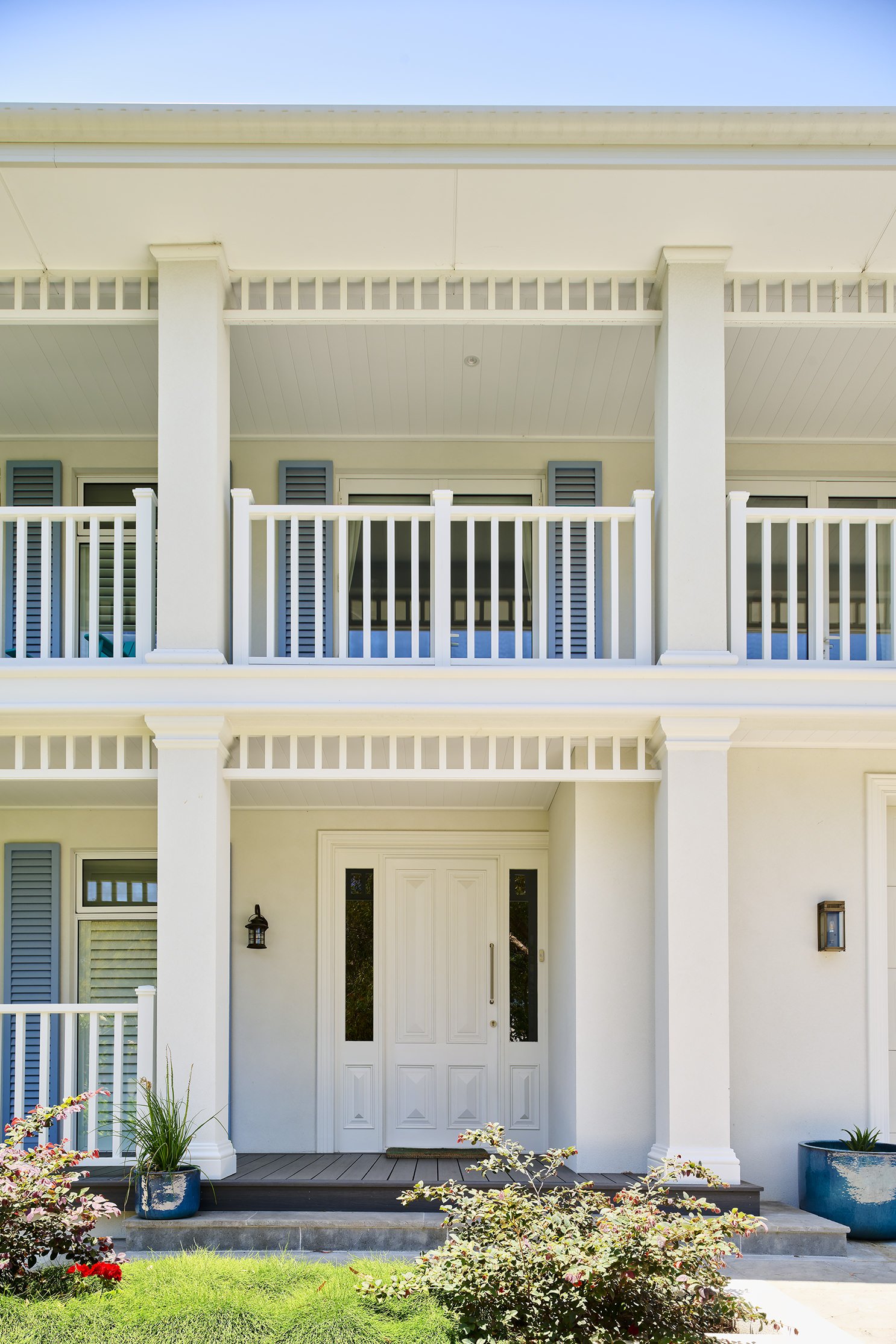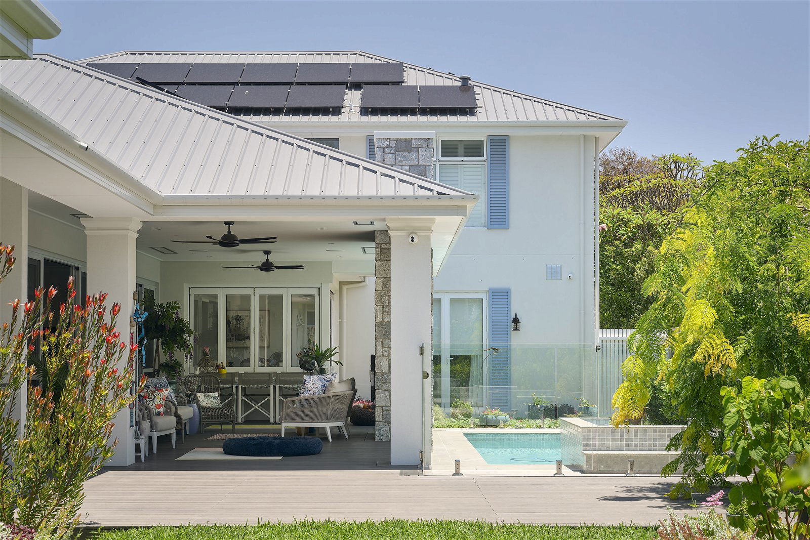 Nestled within the embrace of coastal plantation aesthetics, this residence epitomises the concept of barefoot luxury. The façade, adorned with soft blue shutters reminiscent of the tranquil ocean, serves as an elegant introduction to the home’s character. Drawing inspiration from tropical colonial architecture, the front is graced by striking white pillars, paying homage to the diverse experiences of the well-travelled homeowners.
