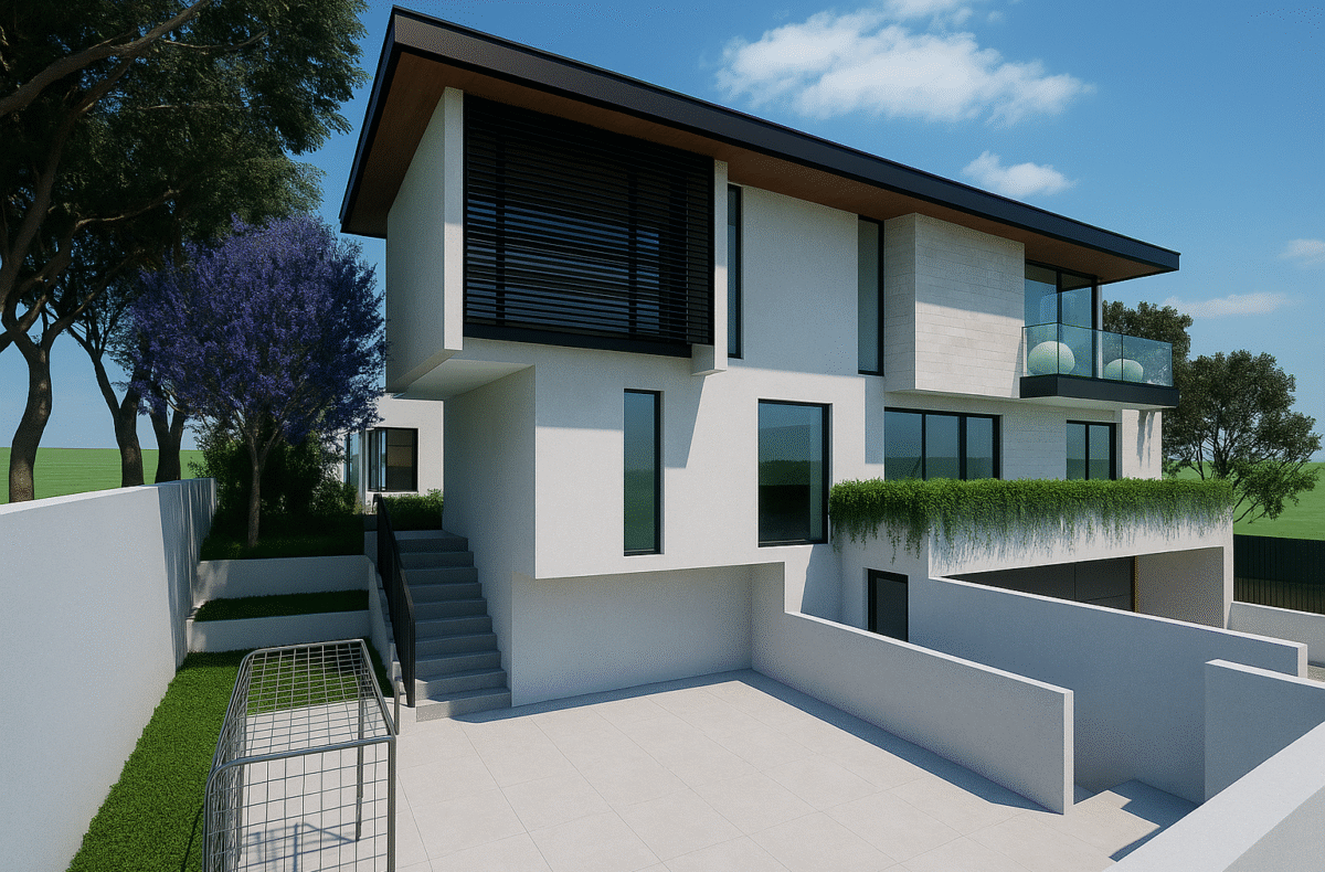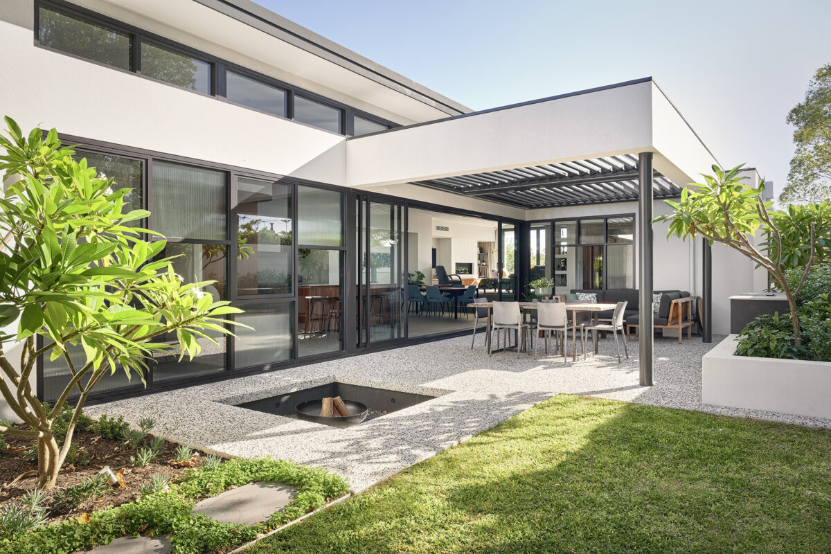 This home was designed as a permanent base for a growing family. With subtle mid-century influences, it feels light, textured, and full of natural warmth, thanks to generous glass panels and floor-to-ceiling windows.