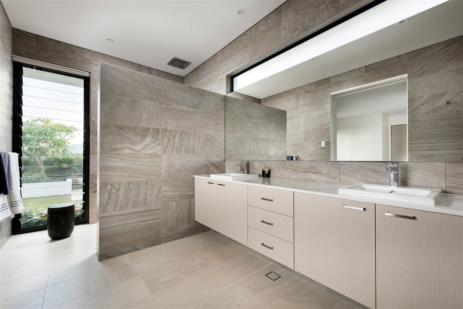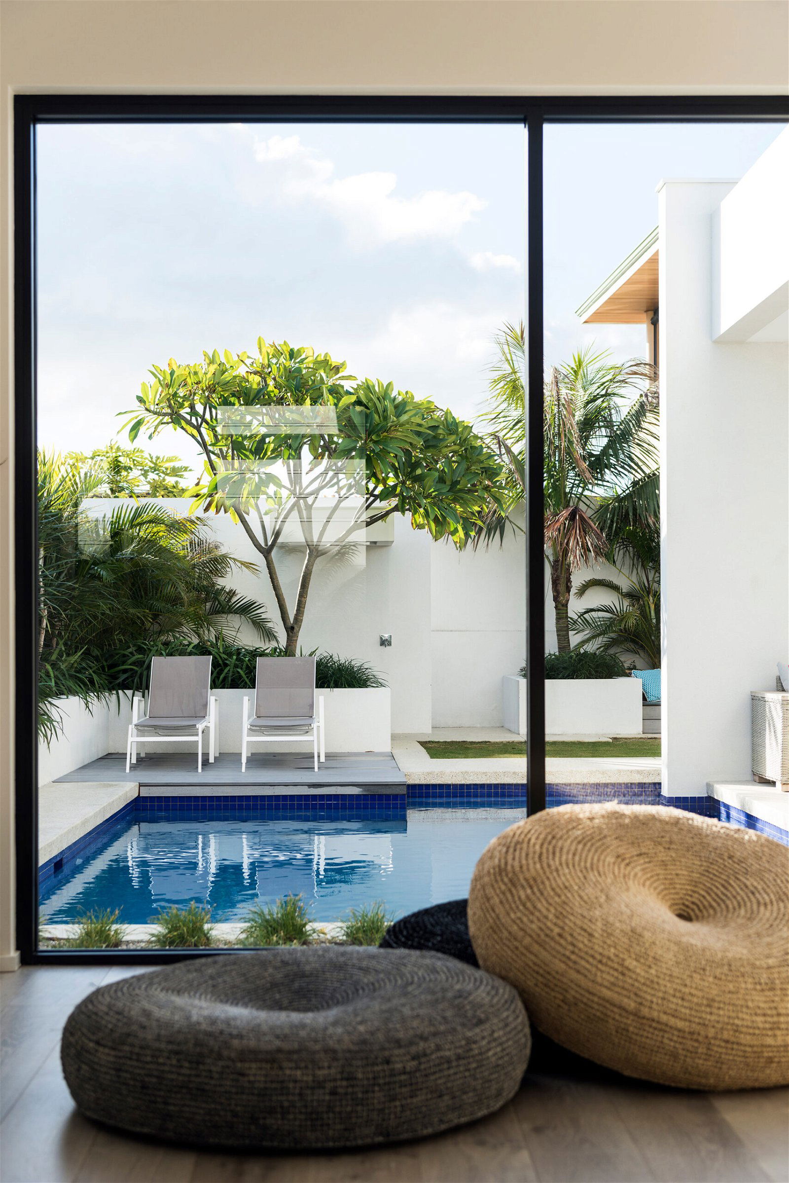 This stunning contemporary two-storey home has been shaped to fit the contours of a sloping block, harness ocean views, create a north-facing backyard sanctuary for year-round enjoyment and deliver well-zoned accommodation for a family of five. The kitchen and main living area are on the upper level, running straight out to the magnificent resort-style alfresco and ‘bridge’ linking the house to the pool deck at the rear.