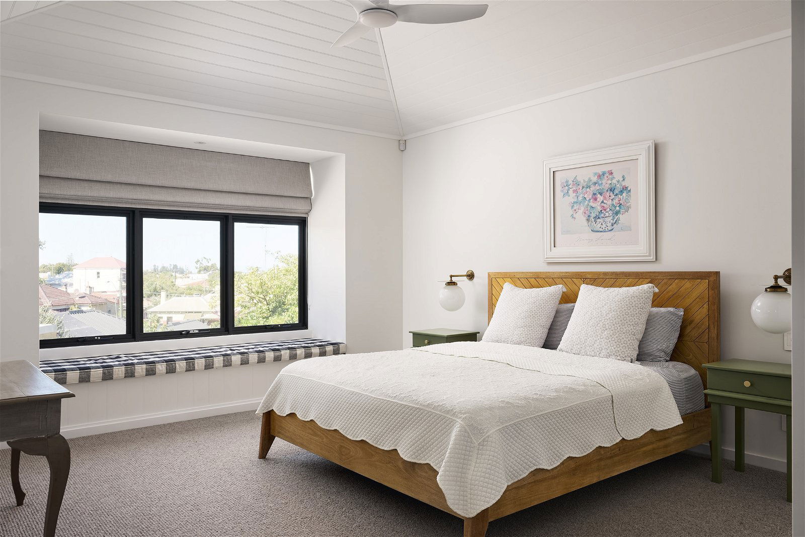 Upstairs, the loft-style master suite frames Fremantle with uninterrupted ocean views.