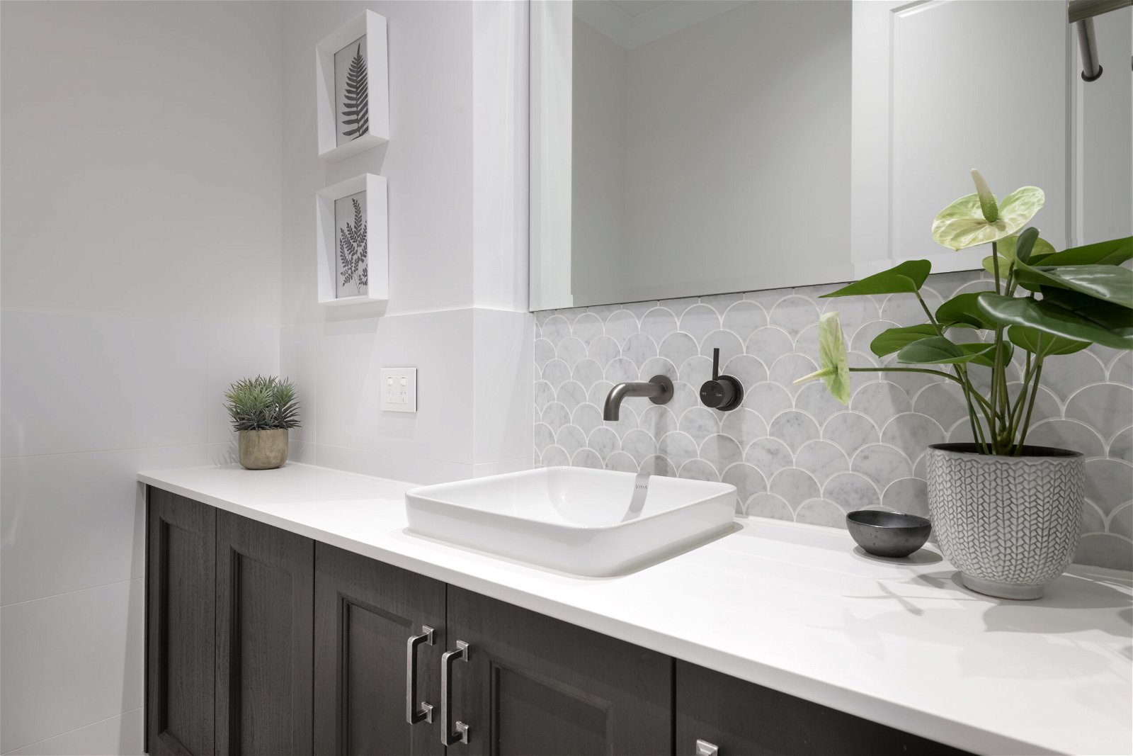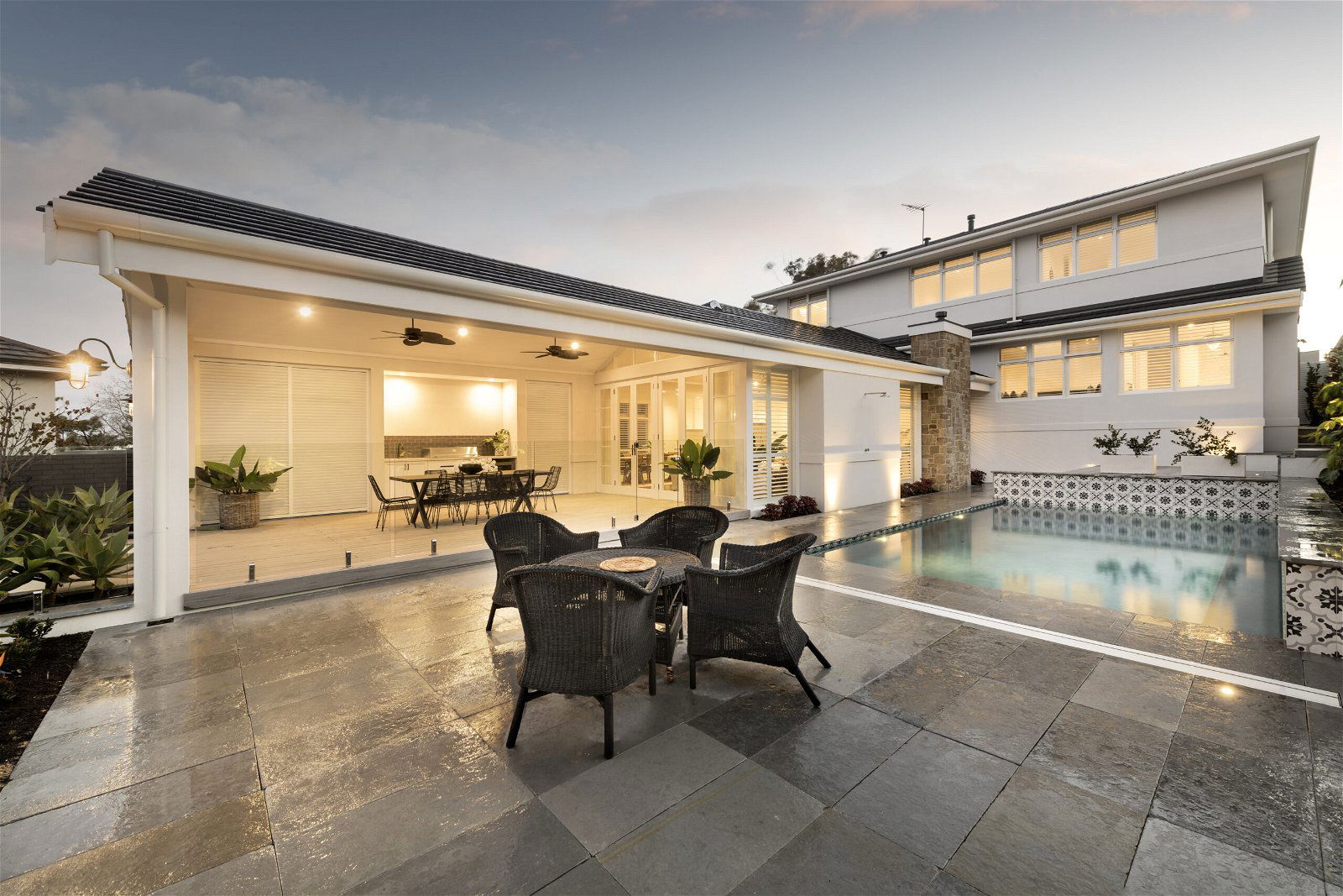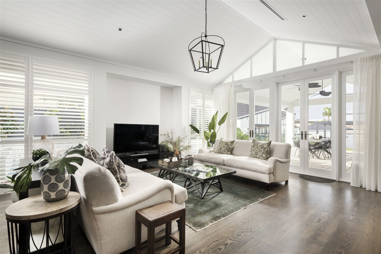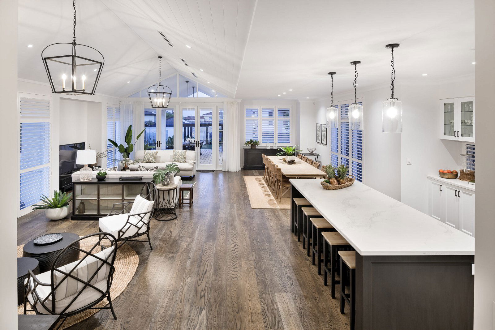 This custom-designed residence takes its inspiration from the Colonial plantation homes of old. With its window shutters, extensive decking, plantation fans, raking ceilings and rich dark timbers contrasting with a light colour palette, it captures the laidback coastal style we associate with luxury retreats in Hawaii and the Caribbean. The floor plan for this large split-level family residence includes a formal sitting room, den, guest suite, a sweeping front veranda, and a children’s zone with a study area and kitchenette. The additional garage with adjoining powder room could be converted into an independent annexe for multi-generational living down the track.